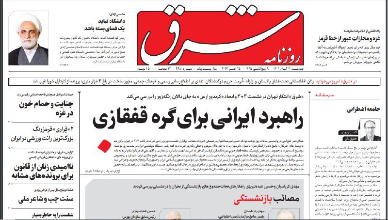 In a note, Shargh discussed Iran's initiative for the Caucasus issue and wrote: Hossein Amir Abdollahian, after holding a meeting of foreign ministers (of Turkey, Russia, Azerbaijan, Armenia and Georgia) in the form of 3+3 in Tehran, called Tehran's initiative "Aras Corridor" instead of the illusory and fake Zangezur Corridor.