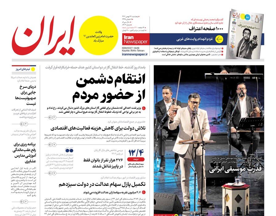 TEHRAN - In a note, the Iran newspaper addressed the failure of the sabotage attack on the gas transmission pipeline in two provinces of the country and wrote: The enthusiastic presence of the Iranian people in the 22 Bahman (11 February) rally has, as usual, angered the enemies of our country.