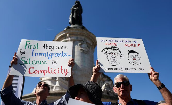 In the British capital, a few hundred people gathered in Trafalgar Square, holding signs saying "Proud American Ashamed" and "WTAF America?" The crowd chanted "Hands off Canada", "Hands off Greenland" and "Hands off Ukraine" while listening to speeches criticising Trump.