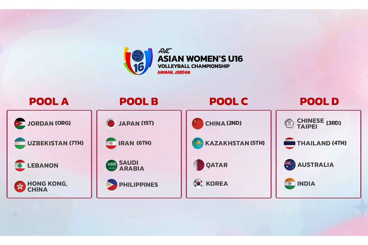 According to the Sunday’s drawing of lots, hosts Jordan are in Pool A with 7th seeds Uzbekistan, Lebanon and Hong Kong China, while top seeds and title holders Japan, 6th seeds Iran, Saudi Arabia and Philippines are in Pool B. Pool C comprises 2nd seeds China, 5th seeds Kazakhstan, Qatar and Korea, with 3rd seeds Chinese Taipei, 4th seeds Thailand, Australia and India in Pool D.